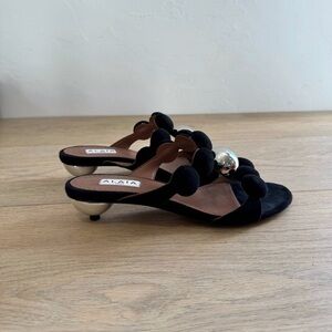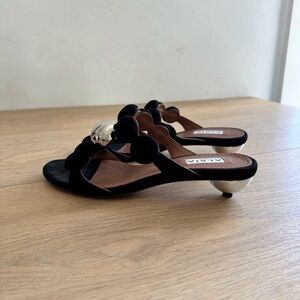 The Bombe sandals from Alaïa are made in Italy from soft beige suede, set on barely-there heels, and finished with the style's signature round embellishments.