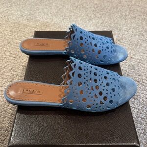Elegant blue mules with intricate laser-cut design. Ideal for casual elegance. Shows some wear on bottom of soles. Comes with box and dust bag