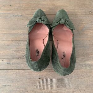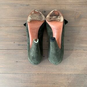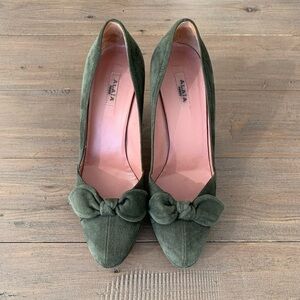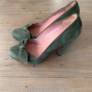 Alaia olive green suede platform pump with bow accents at the uppers and block heels