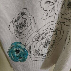 Alain Gerard Vintage NWT White Art To Wear Linen Blend Cardigan Sweater Size S. Pit to pit 21", shoulder to hem 22", Black And White Floral Print With Splashes Of Color, Design Front And Back, Sequins Art To Wear, 3/4 Sleeve, Button Closure, V Neck.