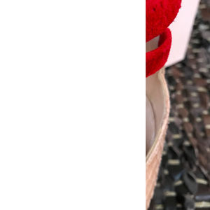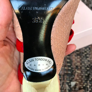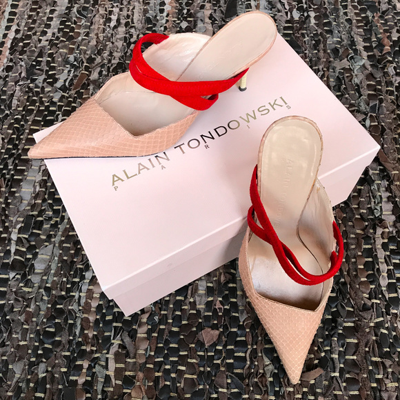 Gorgeous snakeskin slides with red suede straps and white stack heel