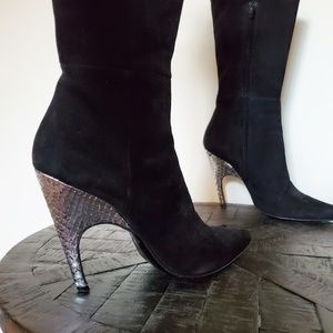 Edgy and classy at the same time, these Alain Tondowski boots will turn heads! With a 4.5" heel height and pointed toe, these boots absolutely mean business. Fun front calf cut out, too! The heel has a silver Python snake texture. Some wear on the soles. Size 40 which is a 9.5 in US Women's. True to size, maybe even better for a size 9 with the pointed toe.