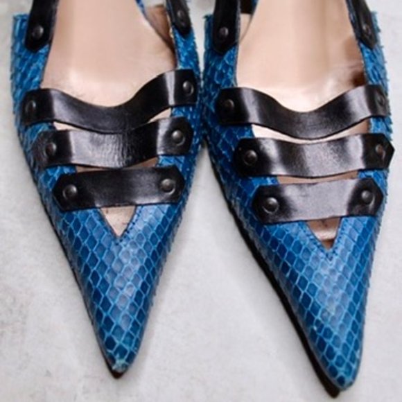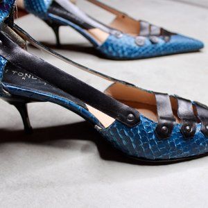 Vintage Alain Tondowski blue snakeskin heals, pointy toes, vintage, purchased in 2003 at Bergdorf Goodman, NY