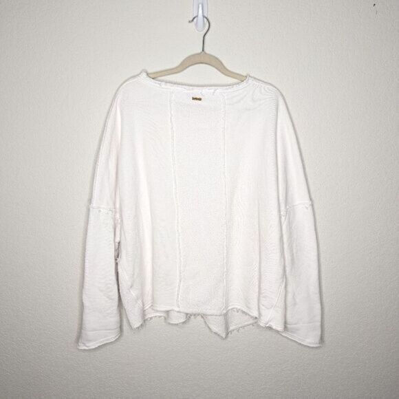 Alala Exhale Asymmetrical Hem Crewneck Sweatshirt White Raw Edge Size XL. Excellent condition, no flaws. Long sleeve, cotton blend. This terry sweatshirt is perfect for cool spring mornings and cool summer nights. Soft, cozy, minimalist look. Please review all photos for item details, fabric content and measurements.