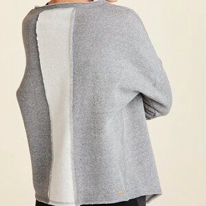 Distressed sweatshirt with raw edge detail on seams. Reverse textured back panel. Asymmetrical front hem.