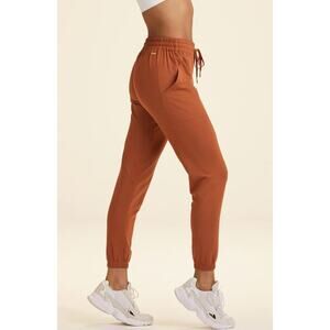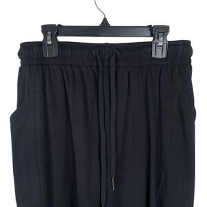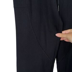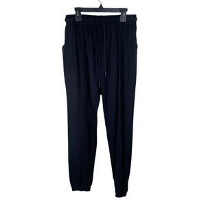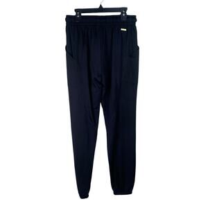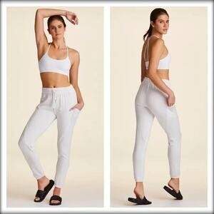 These pants from Alala are made with the most buttery soft jersey knit. They are a pull on style with elastic band around the waist and drawstrings to adjust. They have deep side pockets and elastic around the cuffs. Gold metal tab with logo on the back at waist band. Leg is a tapered style. These pants are brand new with tags still on and sold out online! *listing is for black color only, stock photos are just to show fit