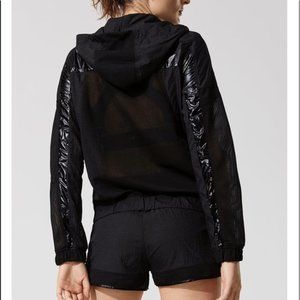“Strata Run” black lightweight hoodie/hooded windbreaker. Sheer mesh with shiny plastic-like metallic fabric stripes down front and sleeves and sheer solid fabric paneling.