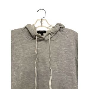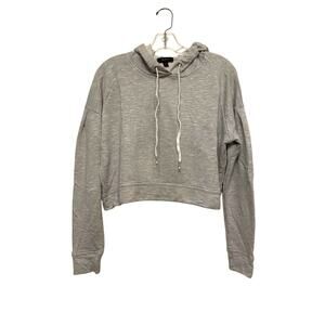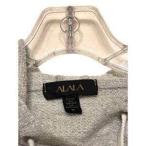 Gently pre-owned Alala Volt Hoodie cropped hoodie sweatshirt in gray/silver. Rayon, cotton, polyester, and metallic blend terry material, lightweight. Hooded with drawstring. Cropped length, relaxed boxy fit. Metallic threads with shine. In good used condition, a few loose threads.