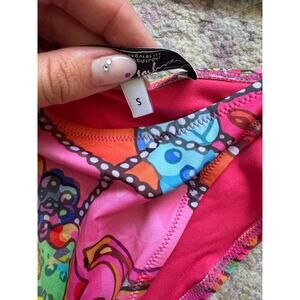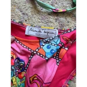 Turn heads poolside in this vibrant two-piece from Alameda Turquesa. Featuring a playful, art-inspired print bursting with color, this bikini combines statement design with a flattering fit. The triangle top and adjustable tie-side bottoms allow for a custom, comfortable fit — perfect for sunshine-filled days and chic resort lounging.