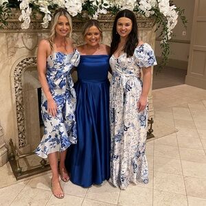 Chic maxi dress with floral pattern. Features a flattering fit and elegant design. Worn once as a bridesmaids dress for a wedding and has been dry cleaned. Runs a bit large, the top of the dress has been altered for a tighter fit on the chest and shoulders and has been hemmed (34B bra and I’m 5’3 for reference). Includes a belt.