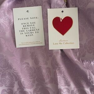 Elegant Alamour Lydia dress with sweetheart neckline, balloon long sleeves, fake buttons accents, no stretch, lace up back, zipper back closure, padded cups, fitted waist, side slit, and flared a-line skirt. Lilac color. The perfect dress for that special event. Offers welcome.