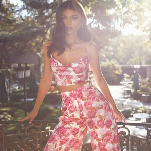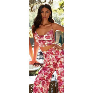 Alamour The Label The Monaco Top & Pants Set. Top Size XS / Extra Small. Pants Size S / Small. Top features cowl neck, sleeveless, lace-up open back, floral print, and cropped length. Pant features, high waist, wide leg, and floral print. 97% Polyester, 3% Spandex. Excellent pre-owned condition, no flaws.