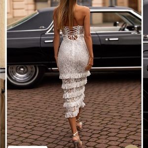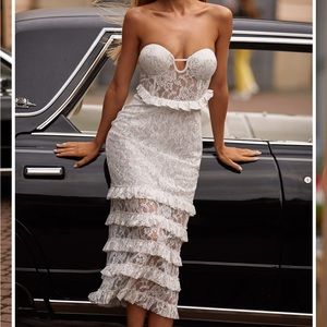 Elegant white lace midi dress. Strapless design with ruffle details. Perfect for special occasions.