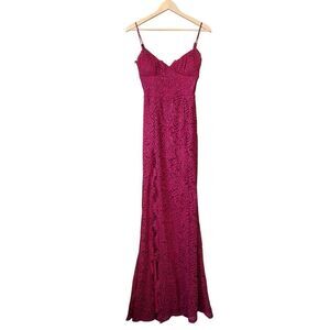Burgundy, Lace, Spaghetti straps, High slit, Sheer overlay, Fitted silhouette, Floor-length, Open back, Scalloped edges, Formal, Evening gown, Elegant, Glamorous, Mermaid style, Sleeveless, Textured, Statement dress, Special occasion, Prom, Wedding guest.