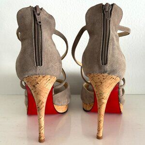 Elegant and rare Alan Chan Couture heels featuring a soft taupe-gray suede upper, cork platform, and signature red embossed leather sole. Designed with delicate wrap-around ankle straps and a zip-back closure for a secure, flattering fit. These heels perfectly blend modern design with timeless sophistication — ideal for special occasions or a night out.