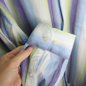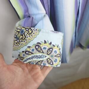 Blue, green, white, purple striped shirt with paisley cuff trim