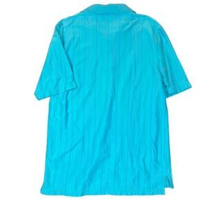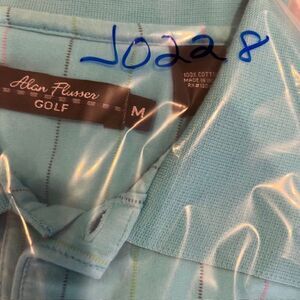 Alan Flusser Golf 100% Cotton Polor Aqua with Multicolor Pinstripes Size Medium. Excellent condition. See photos for details and measurements. Bright aqua turquoise color with thin stripes in blue, green, pink, split hem, comfortable and light, dinner, date, vacation, travel, beach, tailgating,