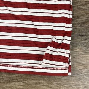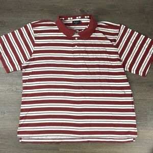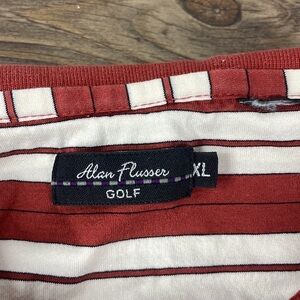 Alan Flusser Golf Mens Rusty Red and Cream Striped Short Sleeve Polo Shirt sz XL. In good used condition. See pictures for measurements, fabric content tag has been removed but I believe it’s cotton.