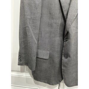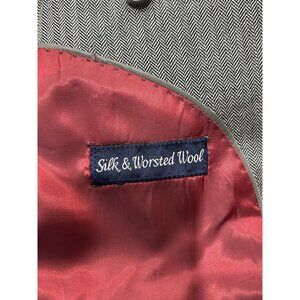 men's blazer, gray jacket, silk wool blend, professional suit jacket, Alan Flusser blazer, herringbone blazer, formal attire, men's 44R blazer, tailored jacket, business wear, double vent blazer, notched lapel blazer, red lining jacket