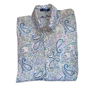 Alan Flusser Paisley Print Long Sleeved Button Down collared shirt with chest pocket Large. Pink, Green Blue color, with extra buttons.