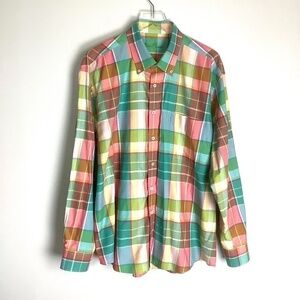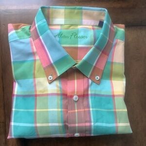 Classic Alan Flusser Multicolor Pink Green Teal Blue Yellow Plaid Button Down Dress Shirt with curved hem for a clean tuck. Size XL. 100% Cotton. Great pre-owned condition- see photos!