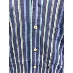 This Alan Flusser shirt is perfect for any casual occasion. The striped pattern, button-down collar, and long sleeves make it a stylish and comfortable choice. The shirt is made of woven cotton material and features a gray, purple, and blue color scheme.