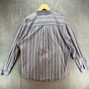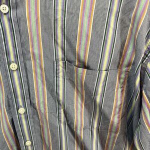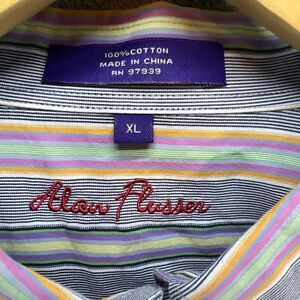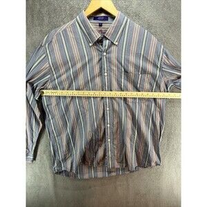 This Alan Flusser shirt is a stylish addition to any wardrobe. With purple and blue stripes, it features a plaid pattern and a collared neckline. The long sleeve button-up shirt is made from machine washable cotton and has a regular fit, making it perfect for casual occasions in the fall, winter, or spring. The shirt is a size XL and has a button-down collar style. The shirt is not vintage, personalized, or handmade. It is a regular fit and has no graphic print. The shirt is suitable for men and is perfect for a casual 90s theme.