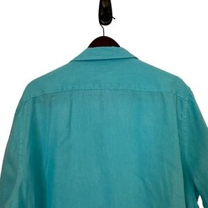 Turquoise Alan Flusser custom linen short sleeve button front shirt. Beach, casual, classic, preppy, contemporary.