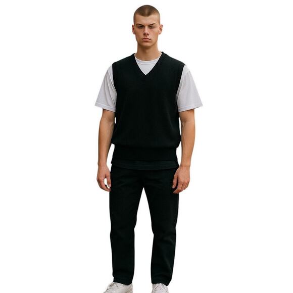 Step into timeless style with this vintage Alan Stuart sweater vest in classic black. Made from 100% acrylic, this men's size large vest features a V-neckline and ribbed hems, perfect for layering over a collared shirt or wearing solo for a sleek minimalist look. Lightweight and versatile—ideal for both casual and business casual outfits.