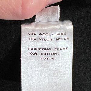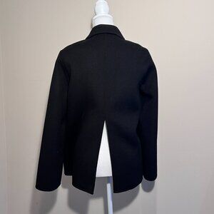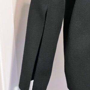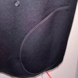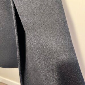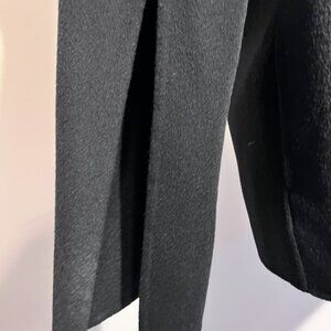 Popular South Korean brand, Alani The Grey super soft swing coat. The coat is wool, but feels like cashmere, with a very soft hand, and fused hems. Two satin covered buttons with inside button to hold double breasted front closed. Two large on seam pockets. Sleeves are bell shaped, and have a peek a boo slit up past the front of arm (above elbow). Sleeves sit a bit higher on the wrist, so this may work for a petite size as well. Back has large slit that hits mid back. In pristine condition, never worn. Mid weight wool. Black. No lining.