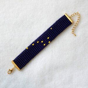 Handmade, handwoven bead loom bracelet made with glass seed beads and nylon thread. Gold-tone lobster-claw clasp and extender chain. Width is 3/4 inch. Length adjustable from 5 3/4 inches to 7 1/4 inches.