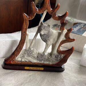 Alaskan Carvings Colletor series wolf in birch trees. Made to look like a carving but is ceramic. Never used and comes in original box.