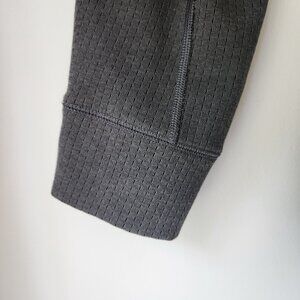 Men's medium. Duluth Trading Co Alaskan Hard Gear (AKHG) Long Sleeve Quarter Zip Jacket. Color is gray with perforated vertical stripes. Red zipper. Front zip pocket on chest with logo.