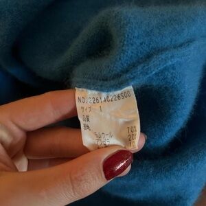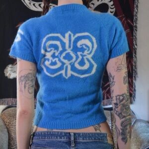 Blue short sleeve sweater with logo design and number 5 on the sleeve.