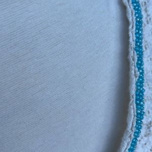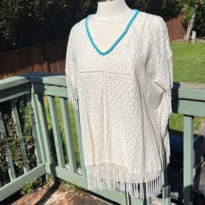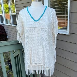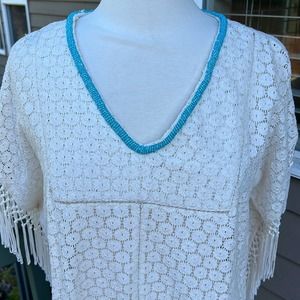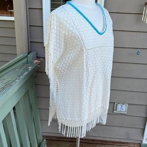 Women’s crochet with fringe swim cover up in cream with v neck aqua blue beading