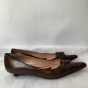 Gorgeous chocolate brown leather pointed toe flats or Kitten heel, depending on how you look at it. The heel is a wider type so it is very stable and only 0.5". The leather is such amazing quality and very soft. Comfortable shoe with a little bit of flexibility in the sole which is nice. Leather lined in peach and contrasting brown. Made in Spain. There is a simple 3D leather petal shape accent on the vamp. Almost like a flattened bow. Very sophisticated simple silhouette. Can be casual or for work wear. Very gently used condition.
