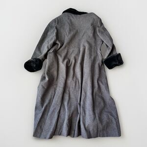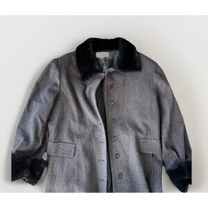 Bust 25. This Albert Nipon women's long wool coat in size 18 plus is a classic and stylish piece perfect for various occasions such as travel, parties, formal events, and business meetings. Made in the USA, this coat features a solid gray color with a tweed fabric type, lined with acetate for added warmth. The long sleeve and button closure add to its vintage charm, while the fur trim accents give it a touch of sophistication. Its trench coat style and designer brand make it a timeless and elegant addition to any wardrobe, ideal for the winter and fall seasons.