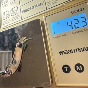 Great vintage/antique condition with an area of enamel loss to front lower. Front features guilloche enameling in white and vibrant emerald green. This piece is constructed of solid 925 sterling silver with bright yellow gold vermeil/plating. Clasp functions perfectly. Weight is 4.23 grams. Please see photos for measurements in inches.