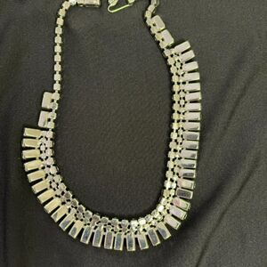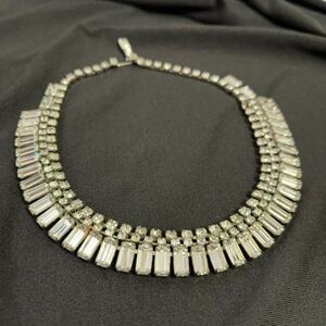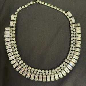 If you are looking for bling, then this is for you. It was much too small for me but wow, what a stunner. Emerald Cut rhinestones scream high end. Two small flaws, one missing stone at the last row of three - shown in photo and some discoloring that I believe will come clean with a proper cleaning - I don't want to damage anything, my loss is your gain. Necklace is 16" from end to end. I have this listed lower for the two flaws, I am firm on the price!