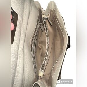 Gorgeous Crossbody bag interior has 2 zipper closure compartments, 2 slit pockets, Silvertone hardware, Leather is super soft,clean inside,No odors, No rips,Genuine Leather made in Italy