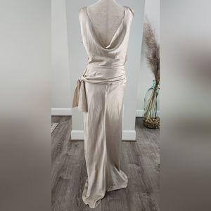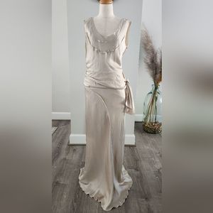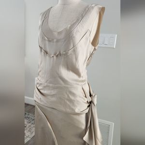Elegant cream maxi dress by Alberta Ferretti. Features a sleeveless design with a draped silhouette. Perfect for formal occasions.
