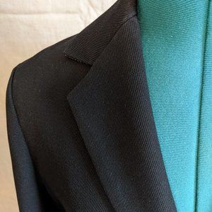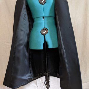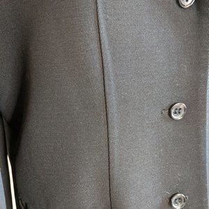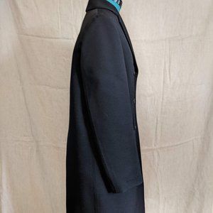 A stylish and chic black coat with ribbed fabric, button front, and three pockets.