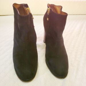 Black suede high heel booties. Zipper closure detail for easy access. Pre-owned in good condition. Please refer to pictures for best description and condition verification.