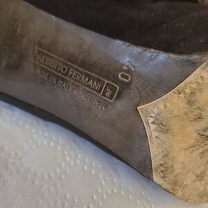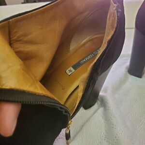 Black suede high heel booties. Zipper closure detail for easy access. Pre-owned in good condition. Please refer to pictures for best description and condition verification.