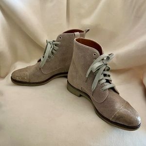 Featuring a clever mix of style and comfort, Alberto Fermani shoes are handcrafted in Italy. These unique ankle boots are feature a canvas exterior with glossy tips that are slightly asymmetrical by design. Leather accent strip on back heel. Leather interior and rubber soles. The tops of the boot cover the ankles. In original box.