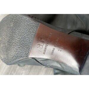 These Alberto Fermani boots are made of green leather with embroidered accents and a mid-calf shaft style. They have an almond toe shape and a block heel style, with a zipper closure. The boots are designed with a bohemian theme and vintage style. They are comfortable to wear and suitable for travel, casual, and business occasions. The outsole material is synthetic and the lining and insole materials are leather. These boots are available in UK size 4, EU size 36, and US size 5.5.