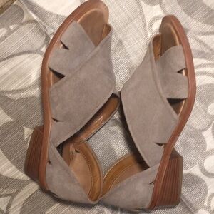 Subtle laser cut strap details a breezy suede Italian crafted criss-cross strap sandal elevated on a stacked heel. Sizing: True to size. - Open toe - Crisscross vamp straps - Suede construction - Cutout back detail - Slip-on - Stacked heel - Approx. 1.5" heel - Made in Italy