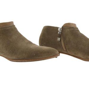 Color/material: Fawn suede. Design details: silver-tone hardware, leather trim. Inner side zip-up closure. Lightly padded leather insole. Smooth leather sole with light traction. 1in heel.. Made in Italy.