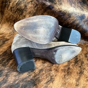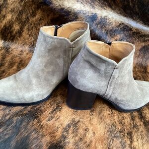 These are a really beautiful and well made pair of suede leather booties made by Alberto Fermani. Features a lovely pointy toe with a full inside ankle zipper entry. Nice strong mid height block style heel. Soft fine suede leather with a great feel and look. Everything you would expect from this brand/maker. Made in Italy. Good used condition with a few slight/minor wear marks.