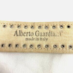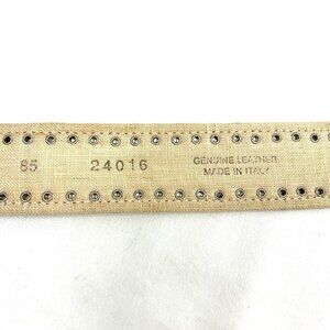 Beautiful men's leather belt by Alberto Guardiani in iridescent white snakeskin embossed leather, embellished with silver rivets down the length of the belt on either edge. Reverse of belt is fabric lined. Oversized shiny silver G logo buckle closure, 5 holes for adjustable fit. Made in Italy.